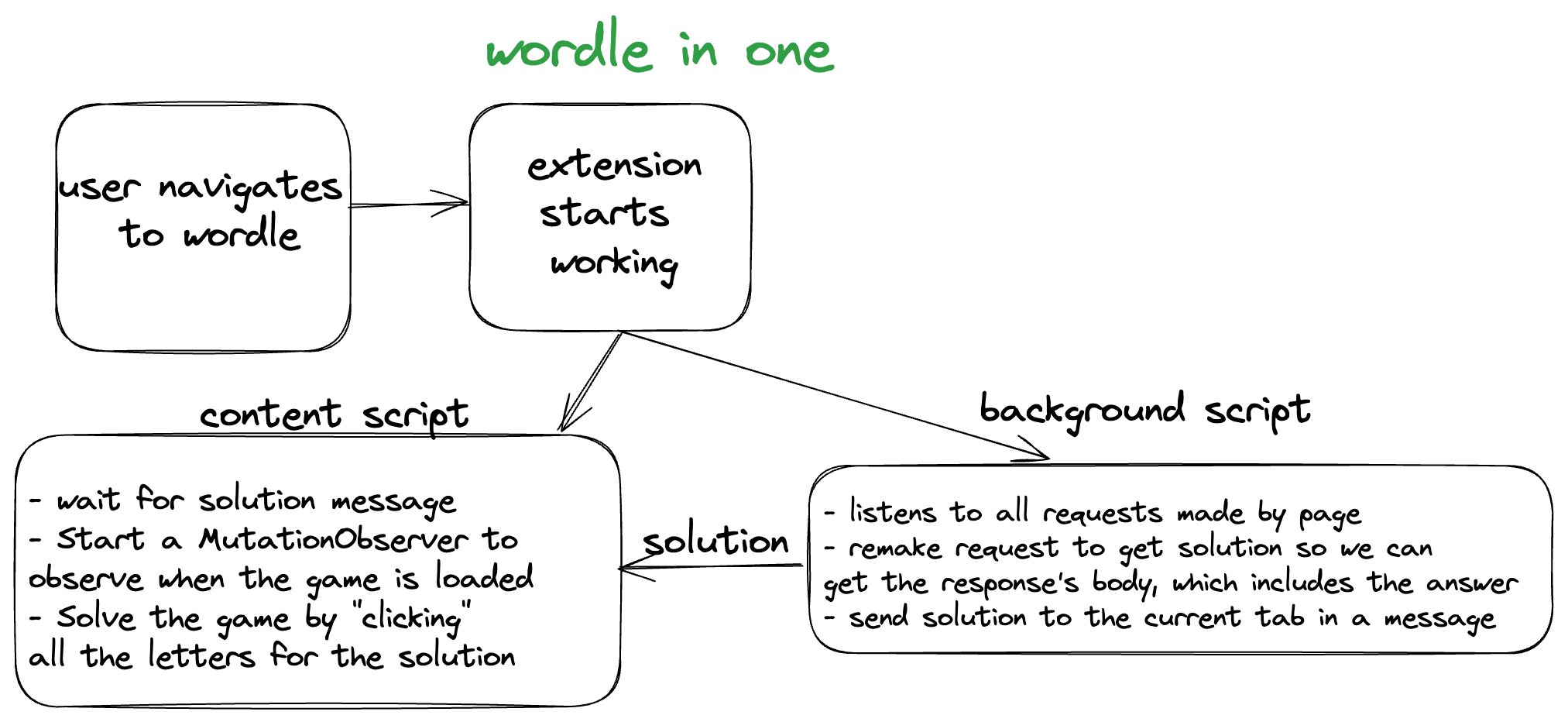 let solution = null;chrome.runtime.onMessage.addListener(function (request, sender, sendResponse) { if (request) { solution = request.solution; }});Once we have the solution in the code, I wanted the chrome plugin to click all the wordle buttons for each letter in the solution so all the user has to do is click enter: